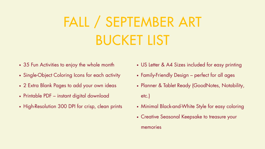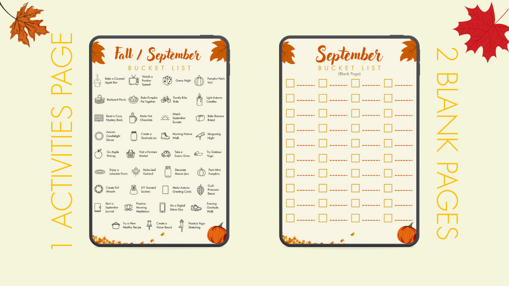 ✨ Bonus Pages: You’ll also get 2 blank bucket list pages. Use them to add your own personalized Fall / September goals or family traditions for an even more unique experience.
