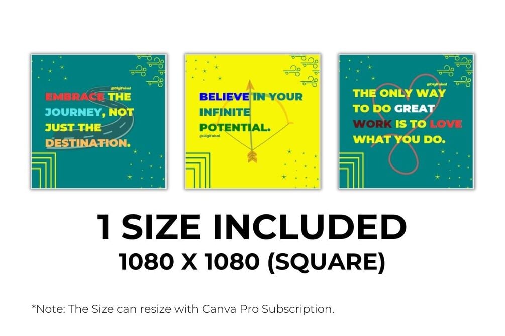 This exclusive pack includes 50 professionally designed templates with eye-catching backgrounds and stylish text layouts. Each featuring an uplifting, motivational quote guaranteed to make an impact. Whether you manage social media for business, personal branding or just for fun these templates will take your posts to the next level!