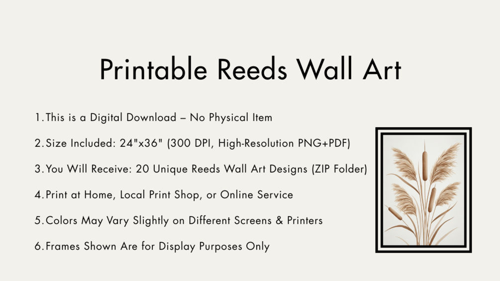 You’ll get 20 high-resolution printable reeds wall art designs in 24x36 inch size, ready to download and print.